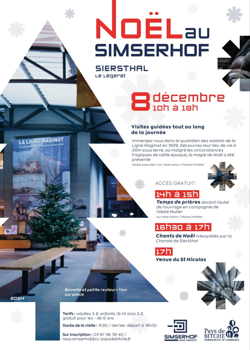 Plongez dans l’histoire et la magie de Noël au cœur de l’ouvrage du Simserhof, véritable joyau de la Ligne Maginot. Cet événement unique vous invite à explorer la vie quotidienne des soldats en 1939, à 30 mètres sous terre, là où l’esprit de Noël parvenait à illuminer les jours sombres de cette époque.